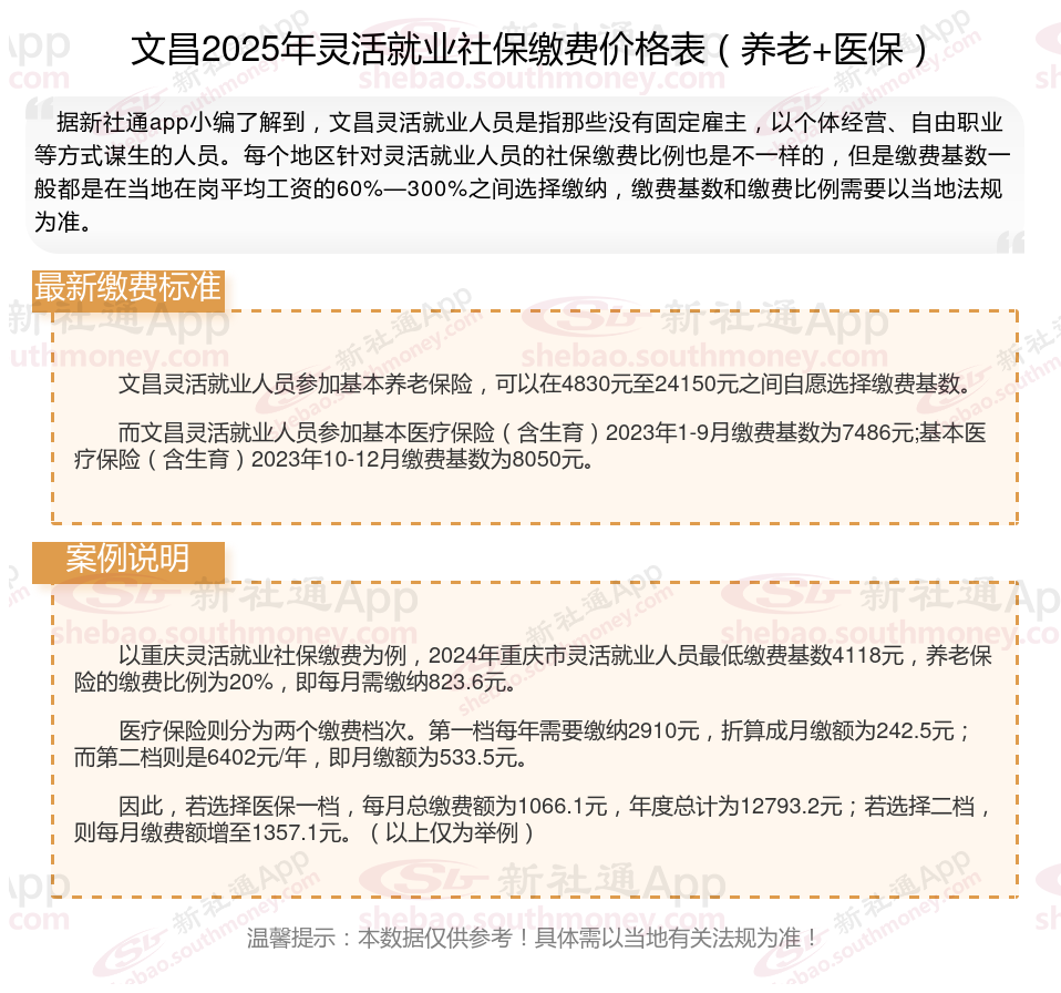 据新社通app数据显示,文昌灵活就业养老保险缴费基数2024-2025年最新标准如下: