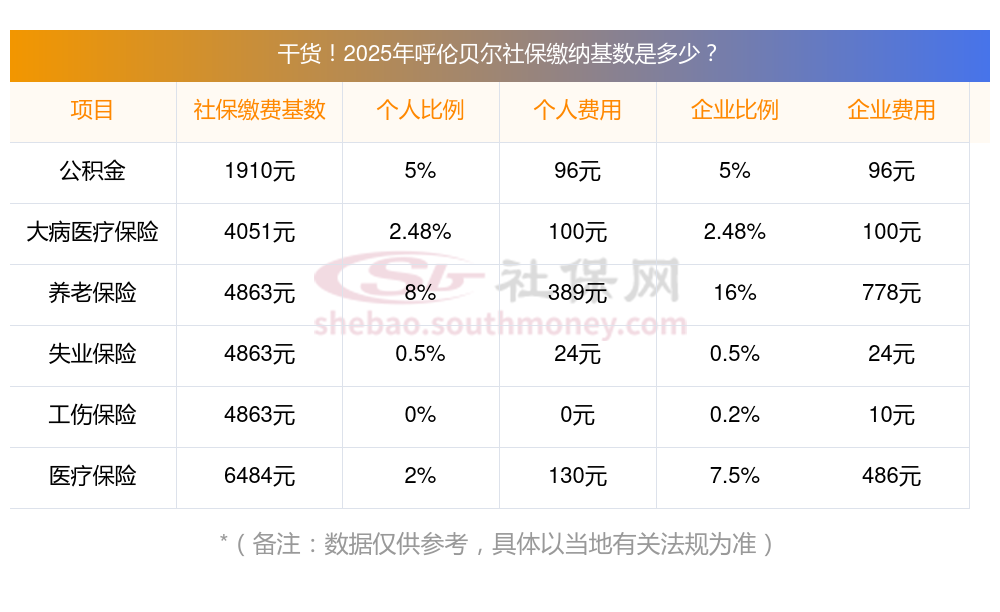 (1)据新社通app-查阅了解到,职工上一年1月至12月全部工资性收入所得的月平均额,确定了社保基数,而社保基数是计算缴纳社会保险费工资基数的依据。 目前该呼伦贝尔社保的缴费基数为:4863.00,个人费用约为:389.04元,企业费用约为:778.08元。