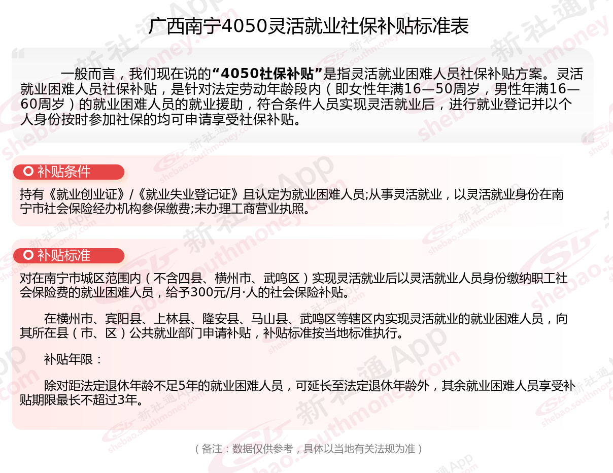 广西南宁补贴多少钱一个月?广西南宁灵活就业4050补贴标准: