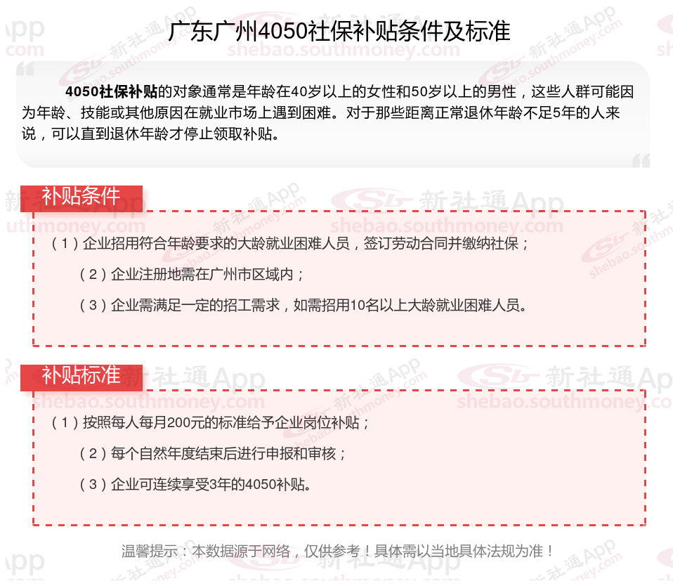 广东广州申请4050补贴需要什么条件,申请4050补贴所需材料有哪些?2025社保补贴来了,每月可多领钱!4050补贴面向的人群,其年龄要求女性年满40周岁,男性年满50周岁。