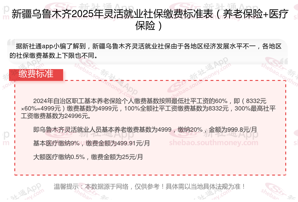 新疆乌鲁木齐灵活就业社保缴费标准来了 灵活就业社保最低要交多少钱?根据新社通app-社保缴费查询工具提供的最新数据如下: