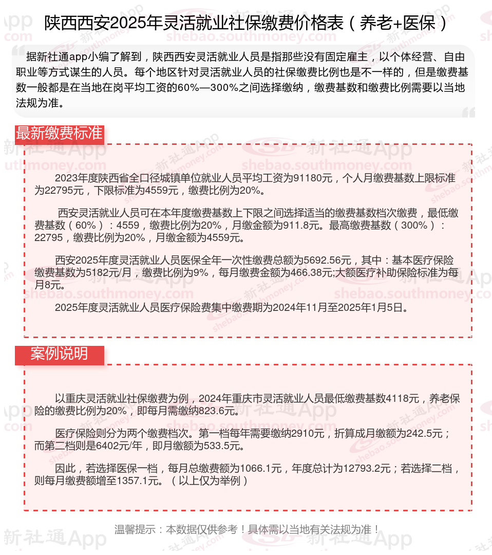 灵活就业社保缴费价格表来了!2024-2025年陕西西安灵活就业人员社保需要缴费多少钱一个月?根据新社通app-社保缴费查询工具提供的最新数据如下: