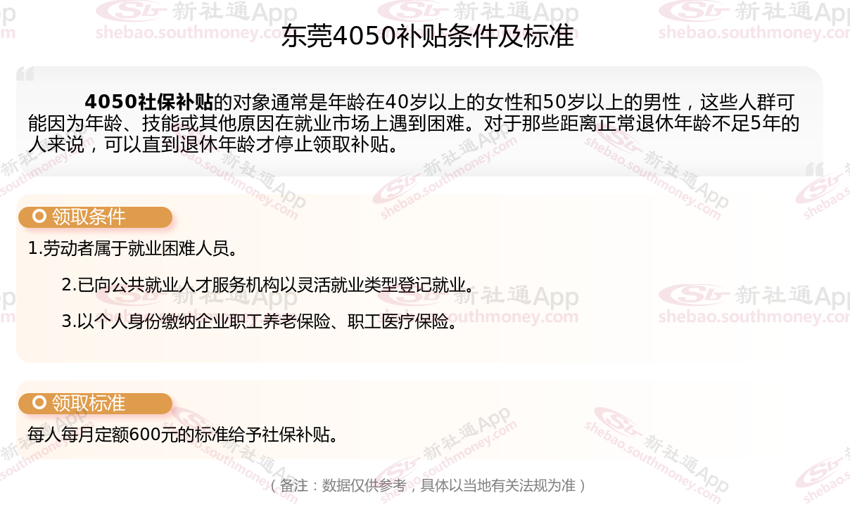 东莞申请4050补贴需要什么条件,申请4050补贴所需材料有哪些?2025社保补贴来了,每月可多领钱!4050补贴的享受对象年龄要求:女性年满40周岁,男性年满50周岁。