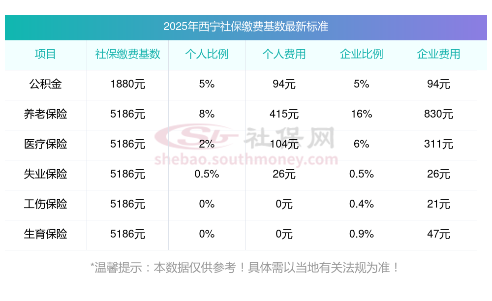 2025年西宁社保个人缴费基数及标准比例是多少,据新社通app-查阅了解到,计算社会保险费缴纳工资基数所依据的社保基数,以职工上一年1月至12月期间全部工资性收入所得的月平均额来确定。 目前该西宁社保的缴费基数为:5186.00,个人费用约为:414.88元,企业费用约为:829.76元。
