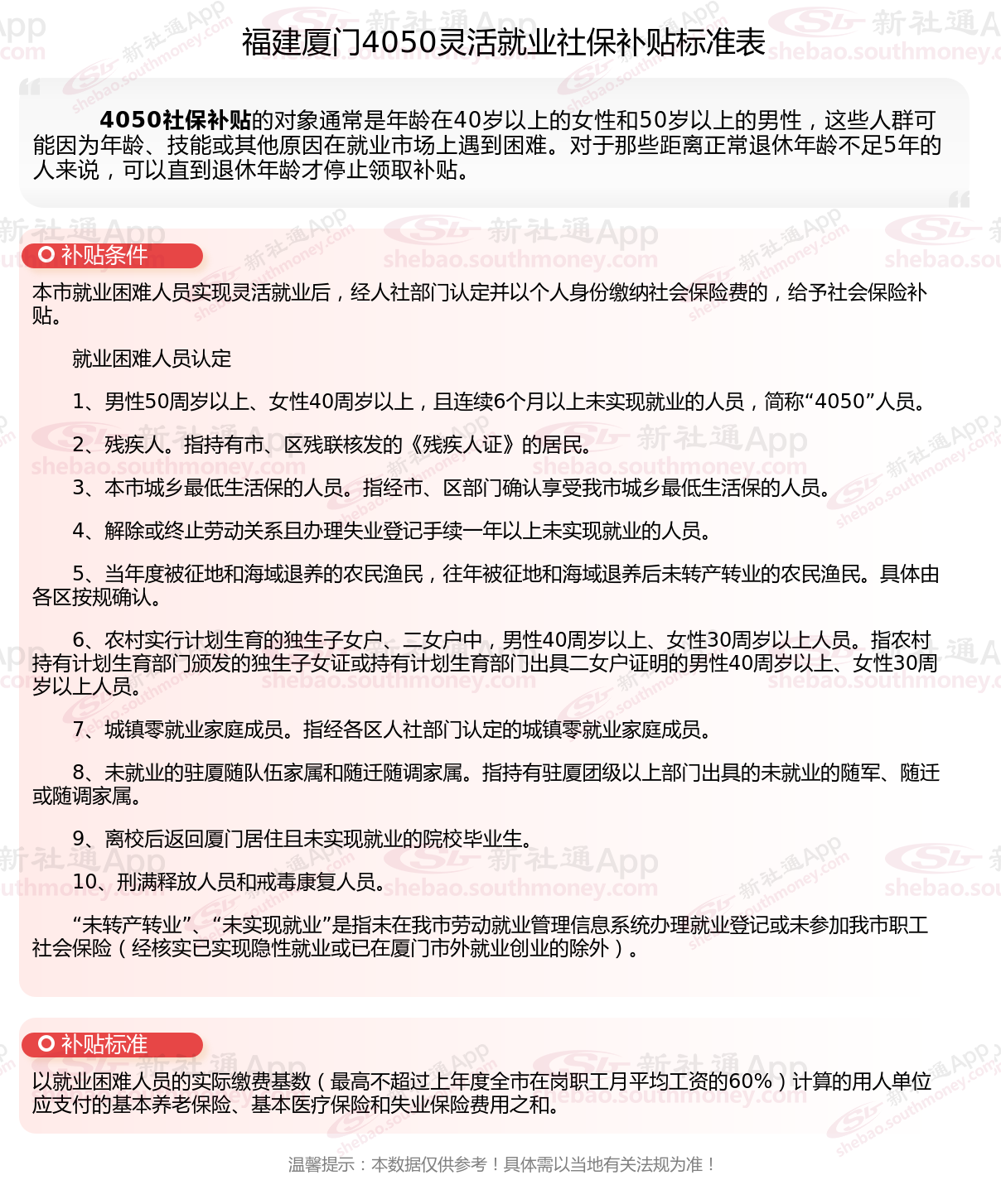 2025年福建厦门4050社保补贴新规 2025年福建厦门4050社保补贴标准及条件是什么?2025福建厦门4050补贴主要针对的是年龄在40岁以上的女性和50岁以上的男性,这些人群通常因为年龄较大而面临就业困难。
