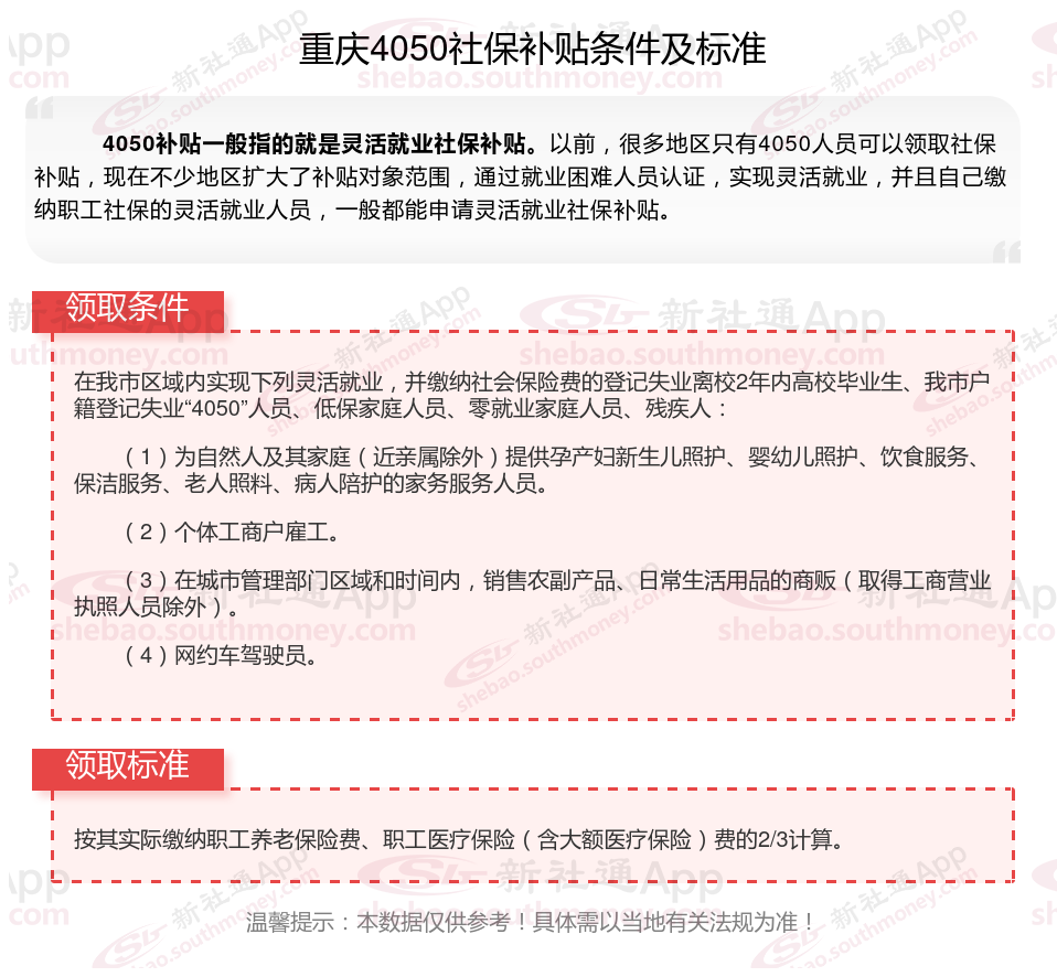 第一、灵活就业社保4050补贴标准是什么样的?2025年重庆4050社保补贴最新多少钱一个月?重庆4050社保补贴如何办理,重庆4050补贴的领取条件主要包括以下几点