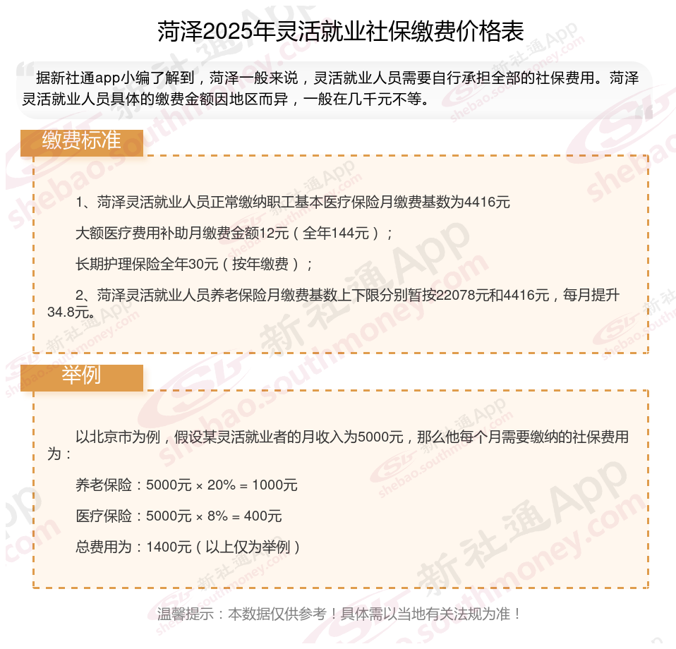 2、菏泽灵活就业人员养老保险月缴费基数上下限分别暂按22078元和4416元,每月提升34.8元。