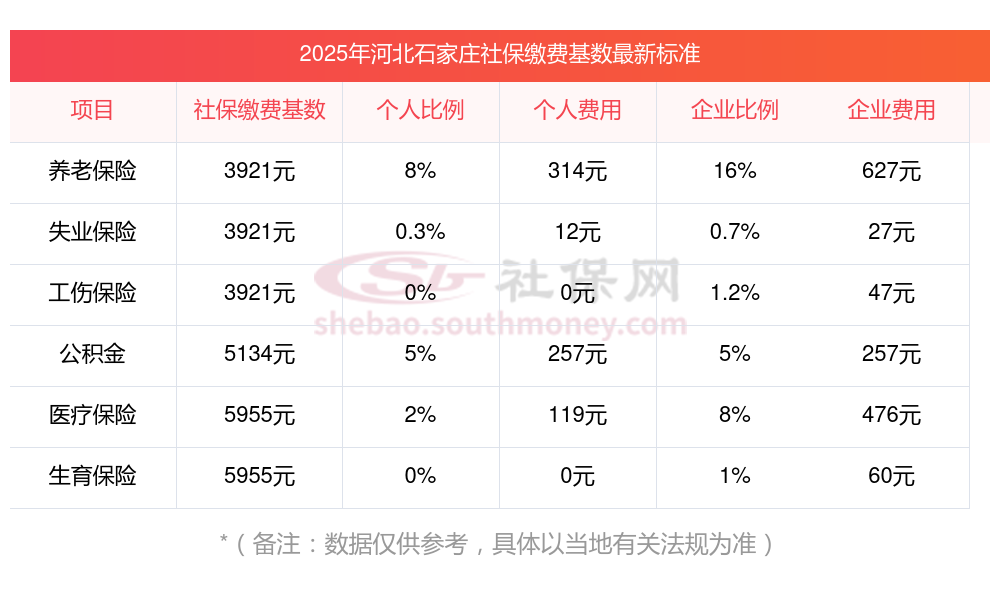 河北石家庄社保缴费基数标准 2025年河北石家庄社保是多少钱一个月?据新社通app-查阅了解到,职工上一年1月至12月期间所有工资性收入所得的月平均额,用来确定社保基数,该基数用于计算社会保险费缴纳的工资基数。 目前该河北石家庄社保的缴费基数为:3920.55,个人费用约为:313.644元,企业费用约为:627.288元。