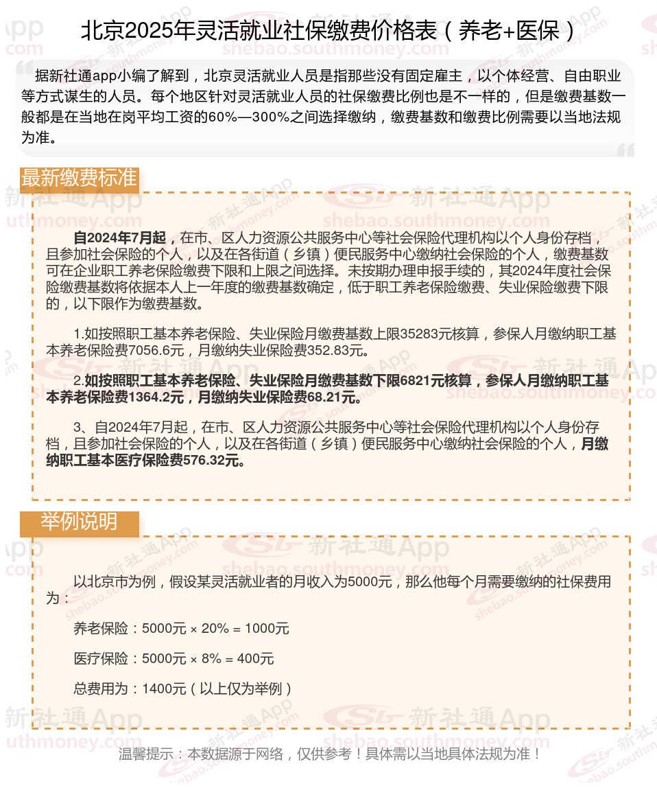 随着经济社会的不断发展,灵活就业群体不断地日益壮大,其社保缴费问题也愈发受到关注。那么2025年北京灵活就业人员社保交多少钱,你了解2025年北京灵活就业人员社保缴费基数及比例吗,接下来随新社通APP小编一起来看看。