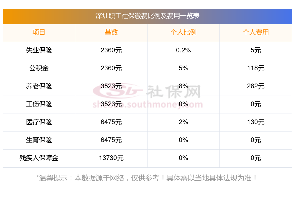 深圳社保各基数的缴费比例是多少?和社保丫丫一起来看看,新社通app-社保缴费查询工具提供的最新数据如下: