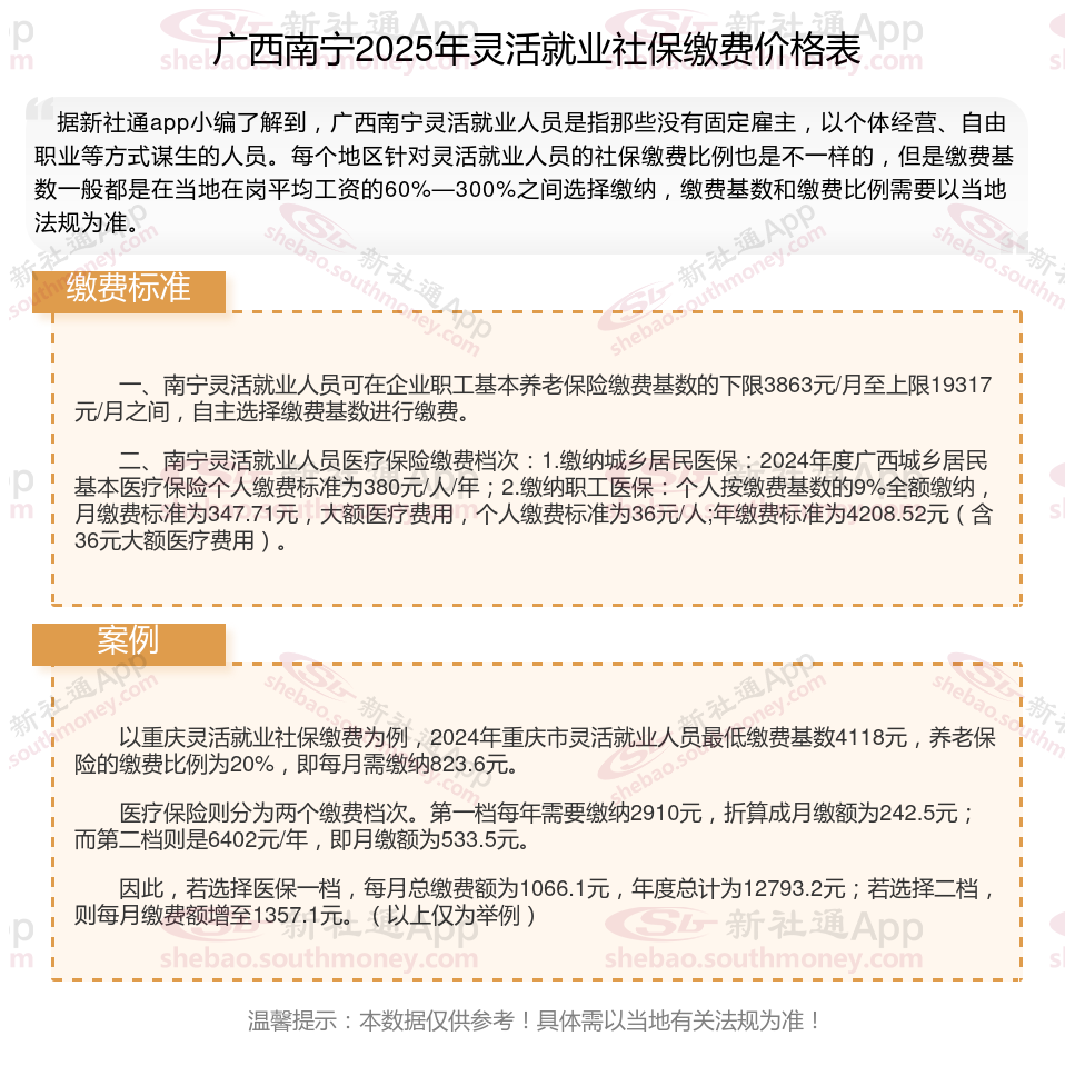 接下来了解一下,广西南宁灵活就业人员社保缴费标准是多少?广西南宁灵活就业人员社保退休能领多少钱呢?根据新社通app-社保缴费查询工具提供的2025社保缴费标准详情数据: