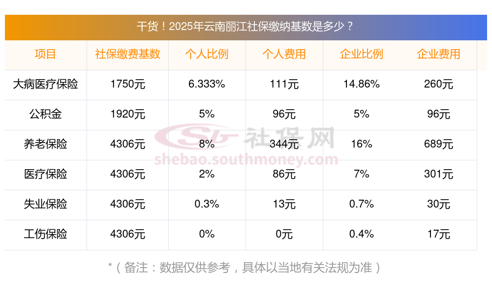 云南丽江的社保缴费情况,依据2025年最新的缴费标准,我们可以详细地进行如下说明。这些标准是根据新社通app-社保缴费查询工具提供的数据整理得出的: