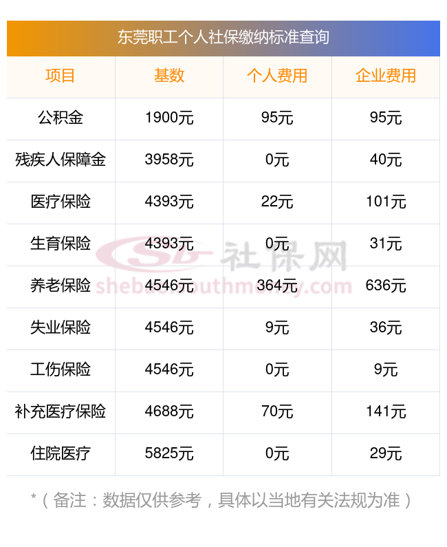 东莞缴费社保比例一览 社保公司和个人各交多少?下表是2024-2025年东莞社保费用明细参考,新社通app-社保缴费查询工具提供的最新数据如下: