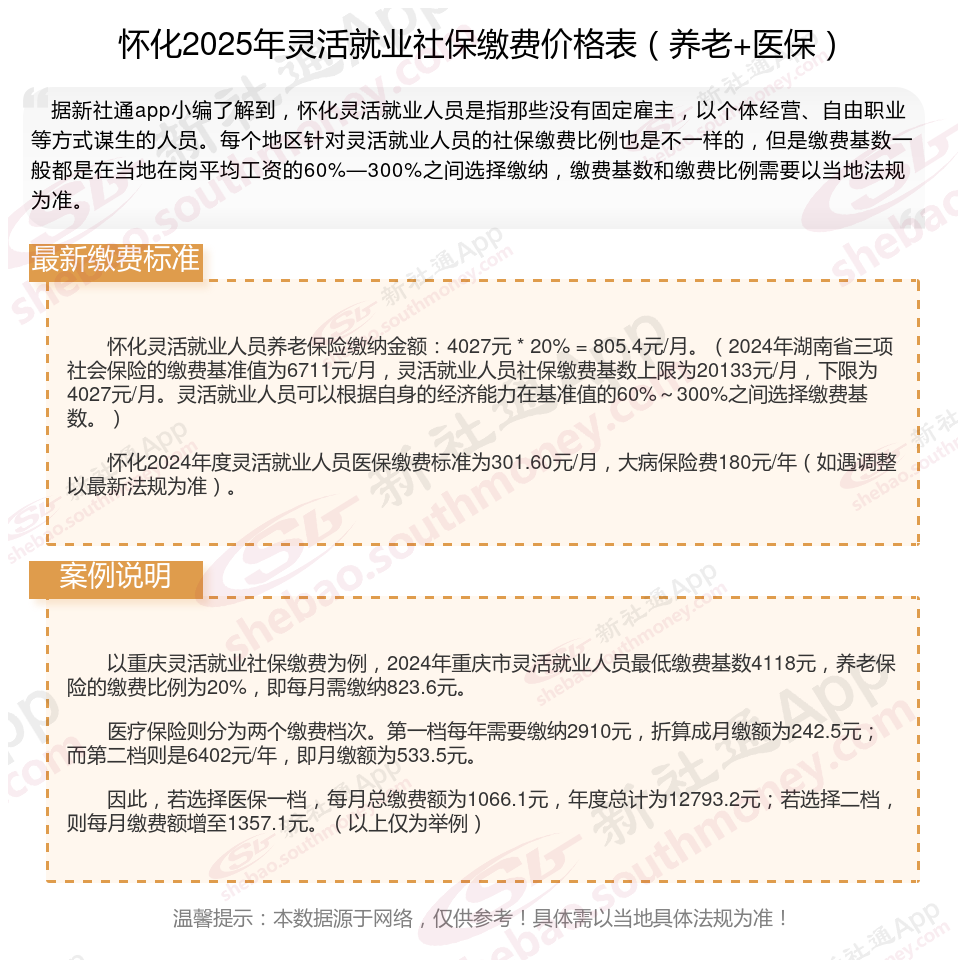 据新社通app数据显示,怀化灵活就业养老保险的缴费基数为:4027元。灵活就业人员参保缴费的比例为个人20%。
