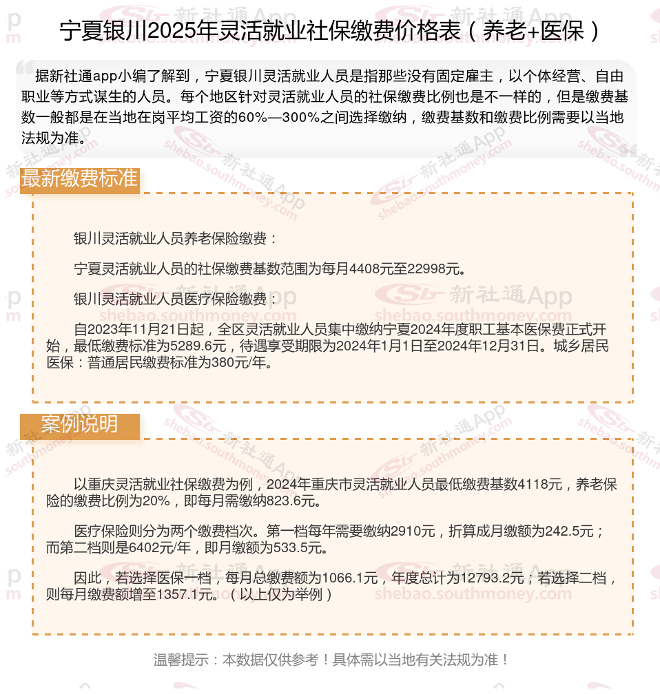 宁夏灵活就业人员的社保缴费基数范围为每月4408元至22998元。