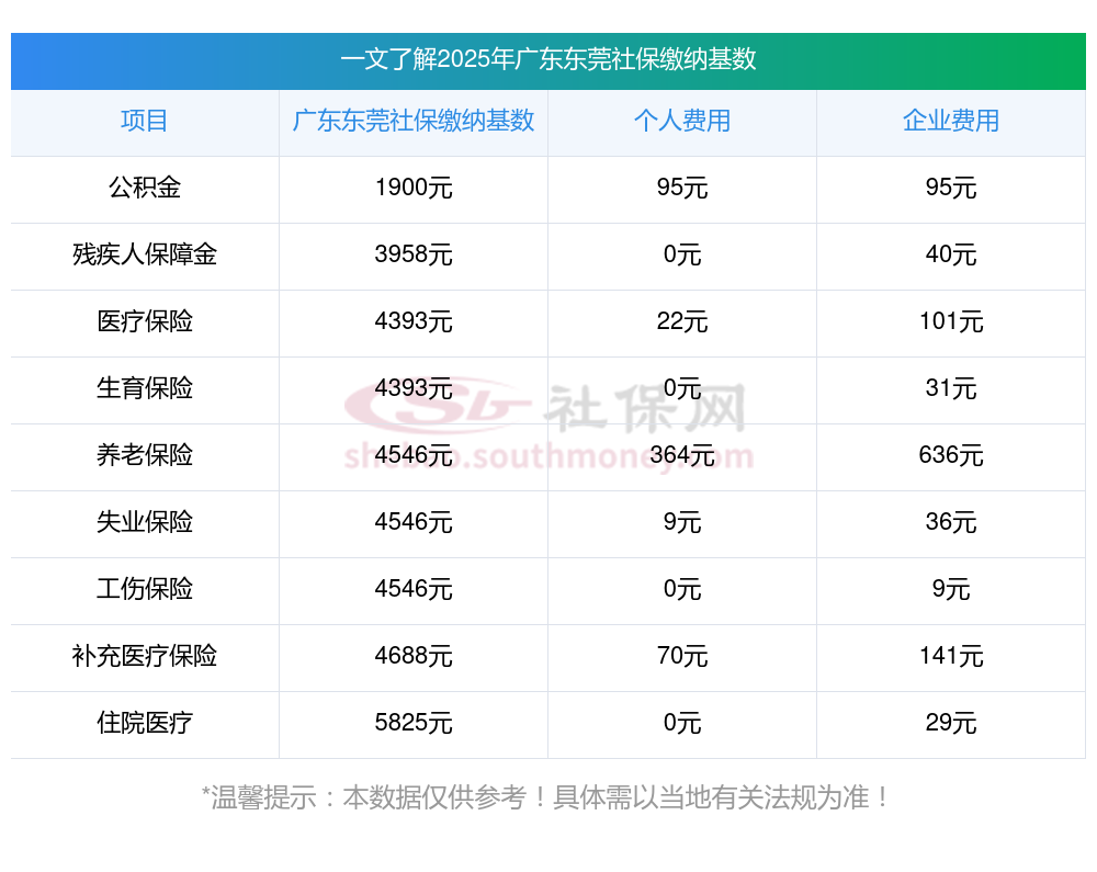 社保缴费金额的大小由缴费基数、缴费比例,以及所在地区在社保方面的具体法规等因素所确定。接下来看看,2024-2025年广东东莞社保缴费多少钱呢?2025年广东东莞社会养老、医保缴纳基数及比例一览表?,如下: