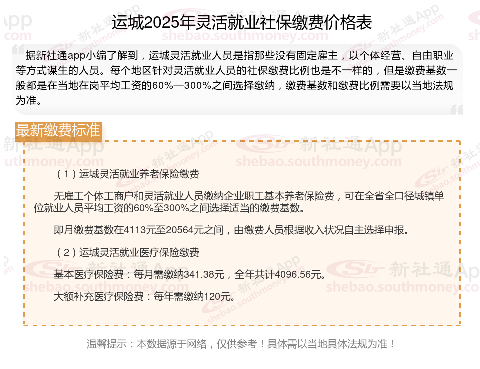 那么,运城灵活就业人员社保缴费基数最新标准,运城灵活就业社保多少钱一个月?根据新社通app-社保缴费查询工具提供的2025社保缴费标准详情数据: