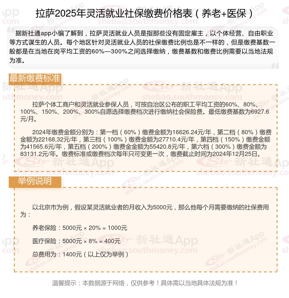 据新社通app数据显示,2024-2025年拉萨灵活就业人员养老保险的缴费标准是根据缴费基数来确定的: