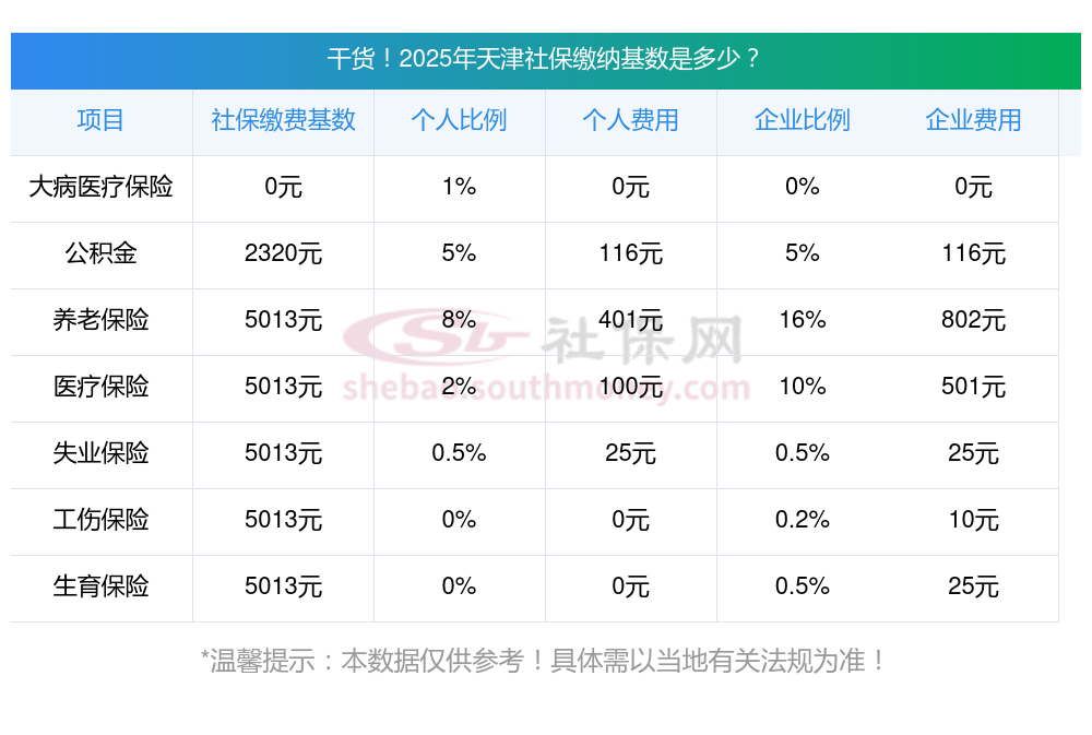 (1)据新社通app-查阅了解到,用于计算社保费缴纳工资基数的社保基数,其确定依据为职工上一年度1月至12月所有工资性收入所得的月平均额。 目前该天津社保的缴费基数为:5013.00,个人费用约为:401.04元,企业费用约为:802.08元。