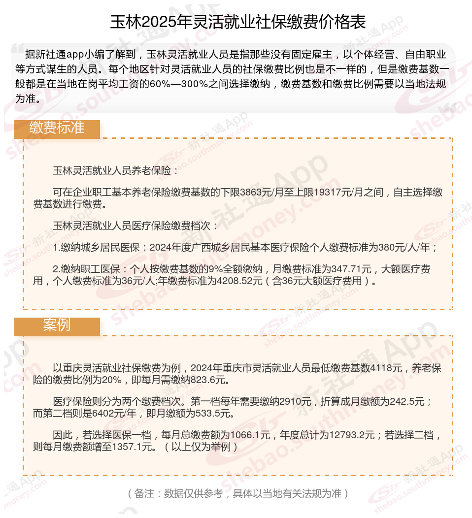 以上就是带来玉林灵活就业社保缴费标准相关知识,内容及数据仅供参考,希望对你有帮助,欢迎关注/下载新社通app解锁更多社保专业资讯。