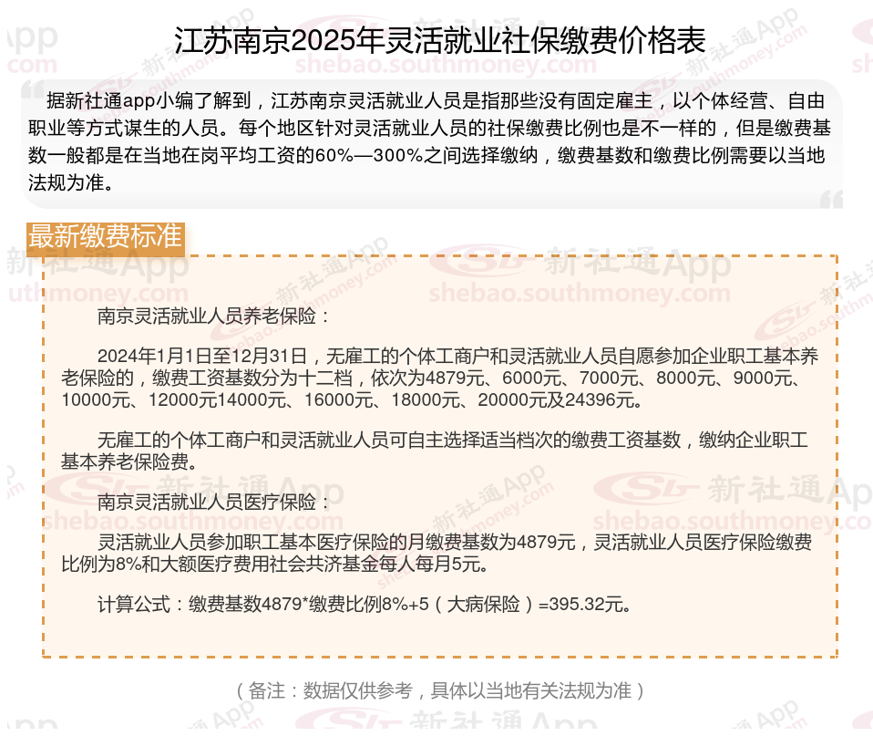 据新社通app数据显示,2024-2025年江苏南京灵活就业人员养老保险的缴费标准是根据缴费基数来确定的:
