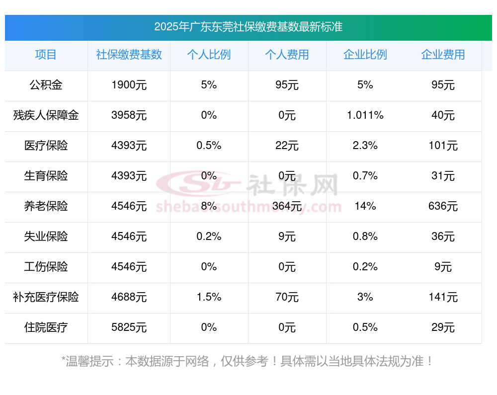 据新社通小编了解到,社保缴费基数的确定,主要基于职工上一年度月平均工资,并结合当地社会平均工资60%-300%的上下限进行调整。 目前,广东东莞社保缴费基数为:4546.00,个人费用约为:363.68元,企业费用约为:636.44元。