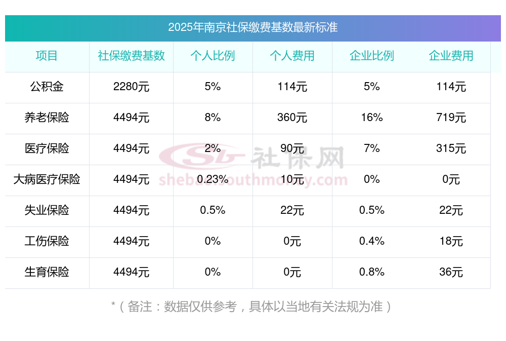 南京社保缴费基数标准 2025年南京社保是多少钱一个月?据新社通小编了解到,社保缴费基数的确立,以职工上一年度月平均工资为主要依据,在此基础上结合当地社会平均工资60%-300%的上下限进行调整。 目前,南京社保缴费基数为:4494.00,个人费用约为:359.52元,企业费用约为:719.04元。