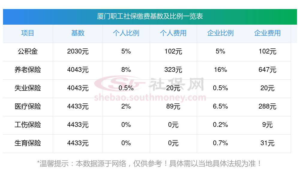 缴费基数、缴费比例以及当地的具体法规等因素相互作用,最终确定了社保的缴费金额。接下来看看,2024-2025年厦门社会保险缴纳基数及比例一览表 厦门个人缴纳社保每月要多少钱,??如下: