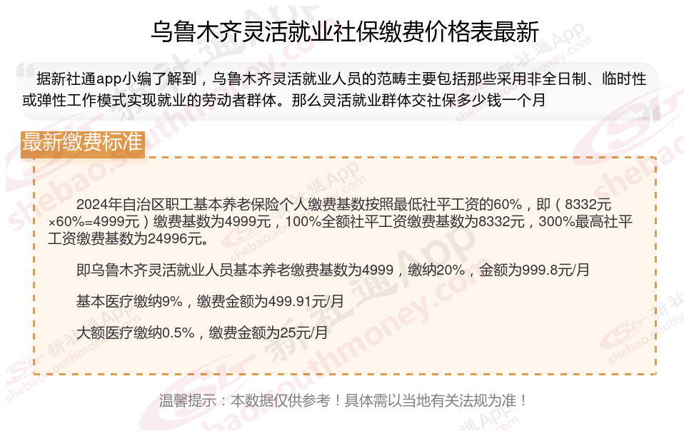 据新社通app数据显示,乌鲁木齐灵活就业养老保险缴费基数2024-2025年最新标准如下: