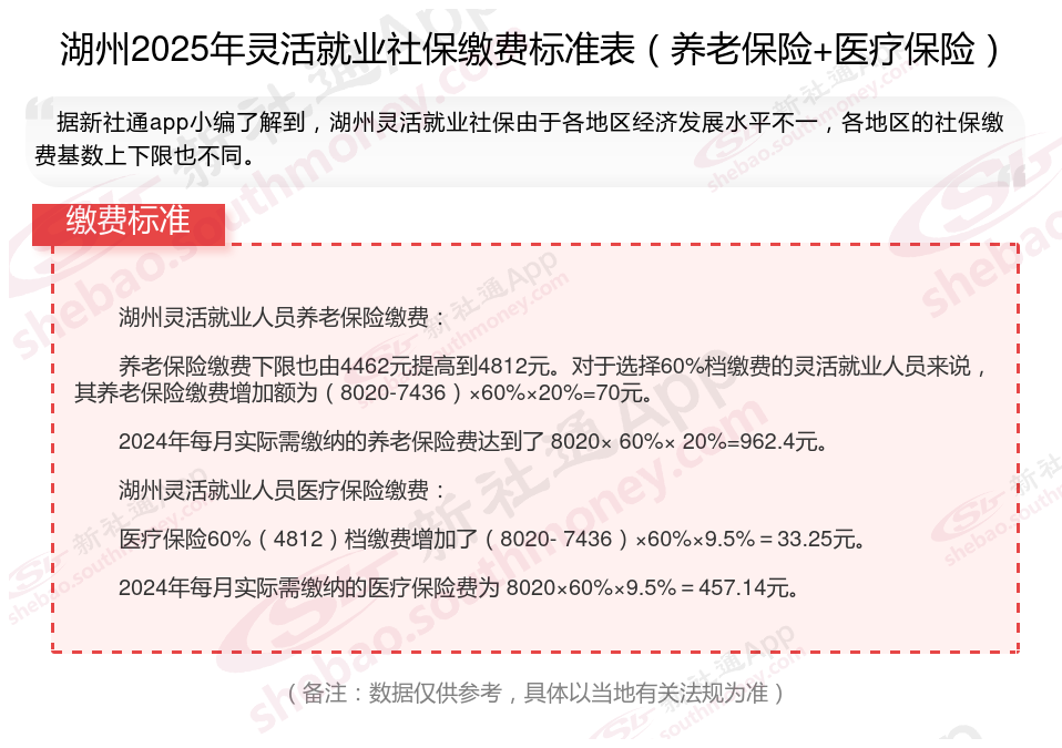 据新社通app数据显示,2024-2025年湖州灵活就业人员养老保险的缴费标准是根据缴费基数来确定的: