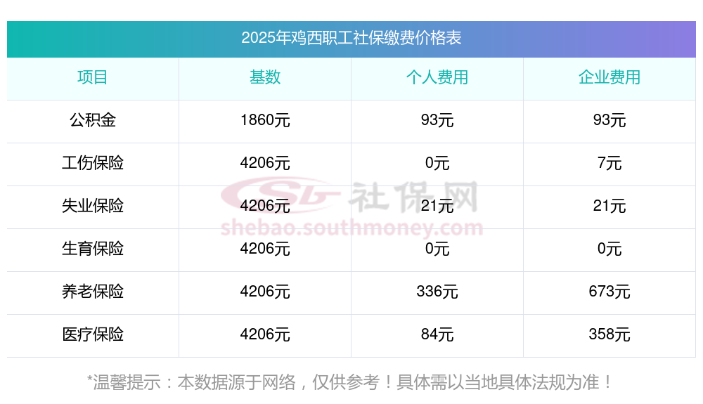 黑龙江社保个人怎么交费?下表是2024-2025年鸡西社保费用明细参考,新社通app-社保缴费查询工具提供的最新数据如下: