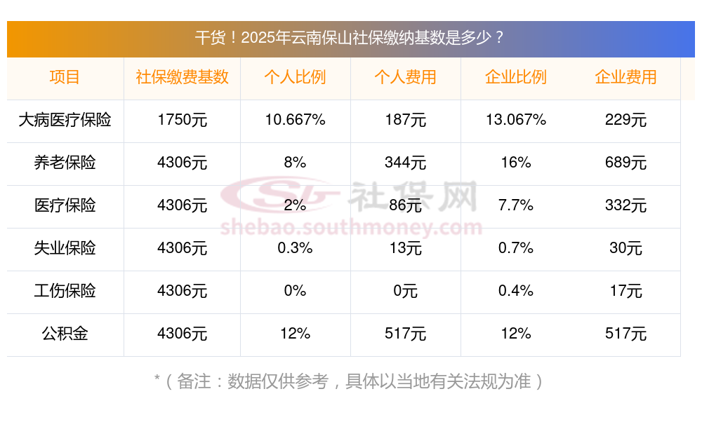 (1)据新社通小编了解到,确定社保缴费基数,主要参照职工上一年度月平均工资,再结合当地社会平均工资60%-300%的上下限来进行调整。 目前,云南保山社保缴费基数为:4306.20,个人费用约为:344.496元,企业费用约为:688.992元。