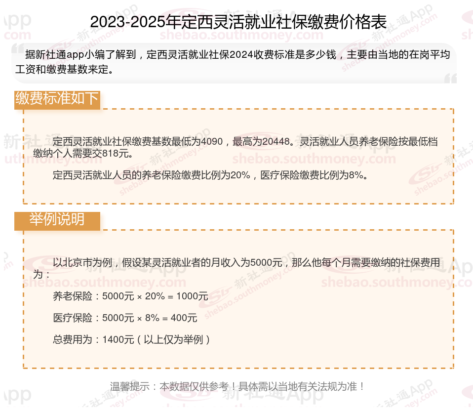 以上就是带来定西灵活就业社保缴费标准相关知识,内容及数据仅供参考,希望对你有帮助,欢迎关注/下载新社通app解锁更多社保专业资讯。