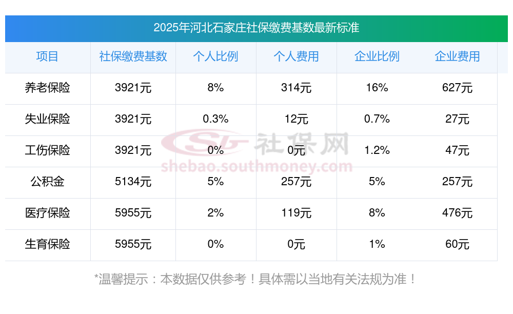 一、据新社通小编了解到,社保缴费基数的确立,以职工上一年度月平均工资为主要依据,在此基础上结合当地社会平均工资60%-300%的上下限进行调整。 目前,河北石家庄社保缴费基数为:3920.55,个人费用约为:313.644元,企业费用约为:627.288元。