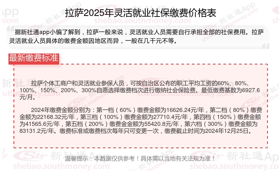 以上就是拉萨灵活就业社保缴费的全部内容,数据及内容供参考!希望对你有帮助,欢迎关注新社通解锁更多社保专业资讯。