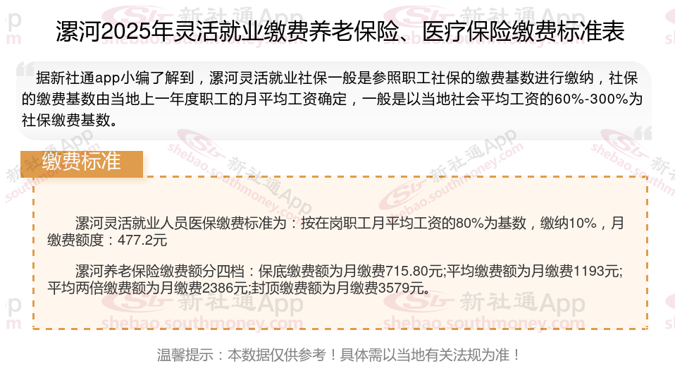 漯河灵活就业社保交多少钱一个月?2025社保缴费标准详情,根据新社通app-社保缴费查询工具提供的2025社保缴费标准详情数据如下: