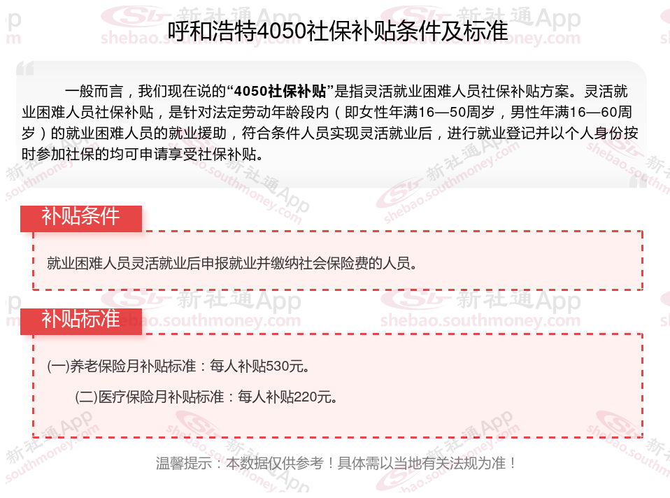 呼和浩特补贴多少钱一个月?呼和浩特灵活就业4050补贴标准: