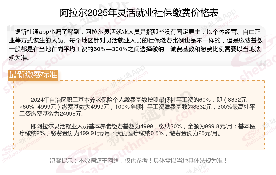 阿拉尔灵活就业社保缴费标准来了 灵活就业社保最低要交多少钱?根据新社通app-社保缴费查询工具提供的最新数据如下: