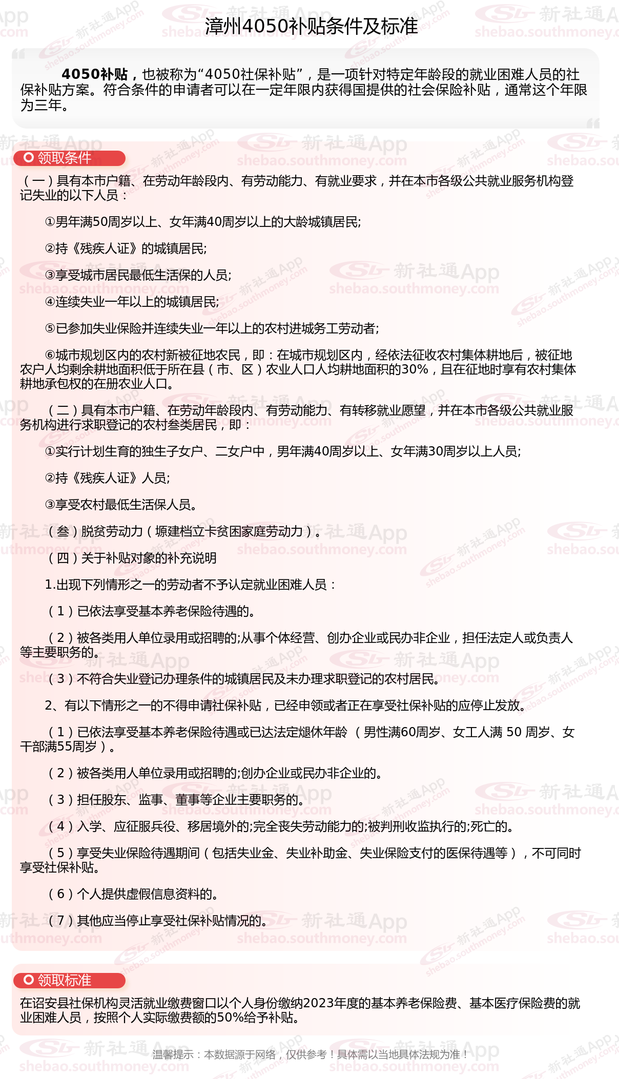 今天聊一下4050补贴的相关内容。4050补贴听起来像是一个针对特定年龄人群的社保补贴。比如女性需年满40周岁,男性需年满50周岁(以申请当年12月31日为截止日期)。那么漳州4050灵活就业困难人员社保补贴多少钱?漳州4050社保补贴可以申请吗?接下来随新社通APP小编具体了解一下4050社保补贴内容。