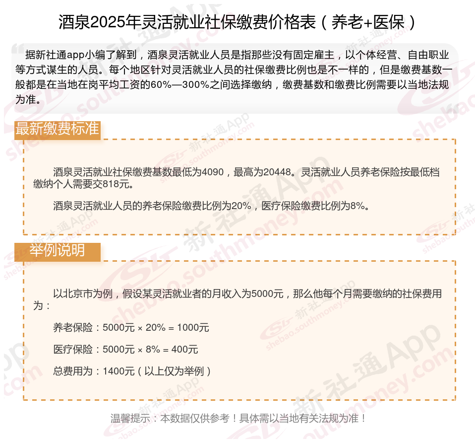 酒泉灵活就业社保2025年收费标准是多少钱,主要由当地的在岗平均工资和缴费基数来定。其次,灵活就业社保缴纳跟职工缴纳不同的地方在于,灵活就业社保参保只能参保养老保险和医疗保险,且缴纳比例完全由个人承担。另外,灵活就业人员社保参保选择,可自由选择参保城镇职工社保和城乡居民保险。2025年酒泉灵活就业社保缴多少钱?如何缴纳?怎么计算待遇?新社通APP小编将在下文为您详细说明。