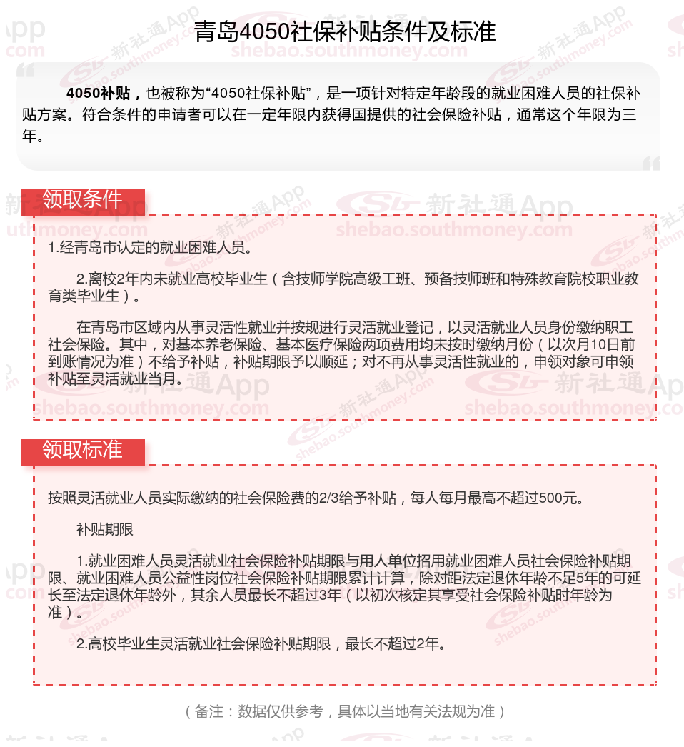 青岛“4050补贴”开始发放,申请4050的条件和要求材料?青岛4050社保补贴标准是多少钱一个月?满足4050补贴享受条件的人员,在年龄上必须达到女性年满40周岁,男性年满50周岁。