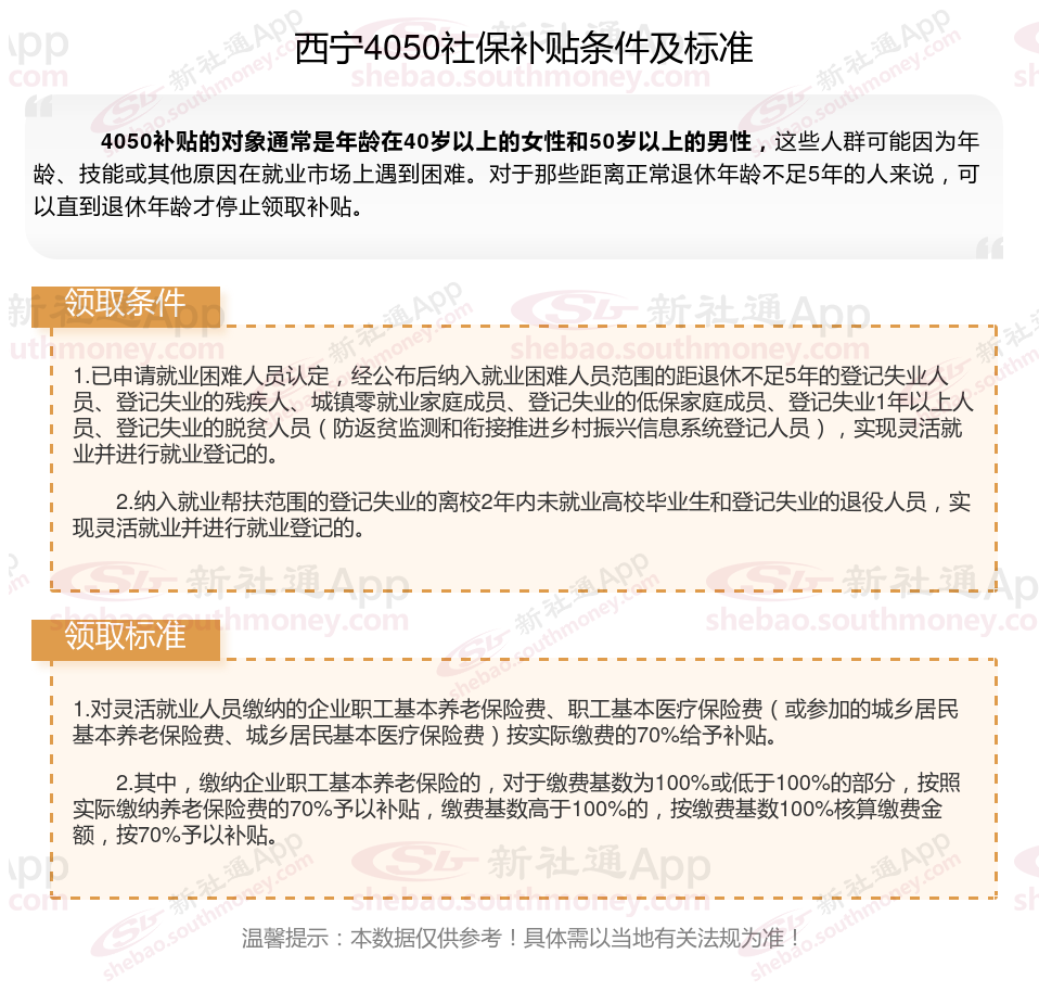 西宁“4050补贴”开始发放,申请4050的条件和要求材料?西宁4050社保补贴标准是多少钱一个月?对于4050补贴的享受对象而言,年龄要求呈现为女性年满40周岁,男性年满50周岁。