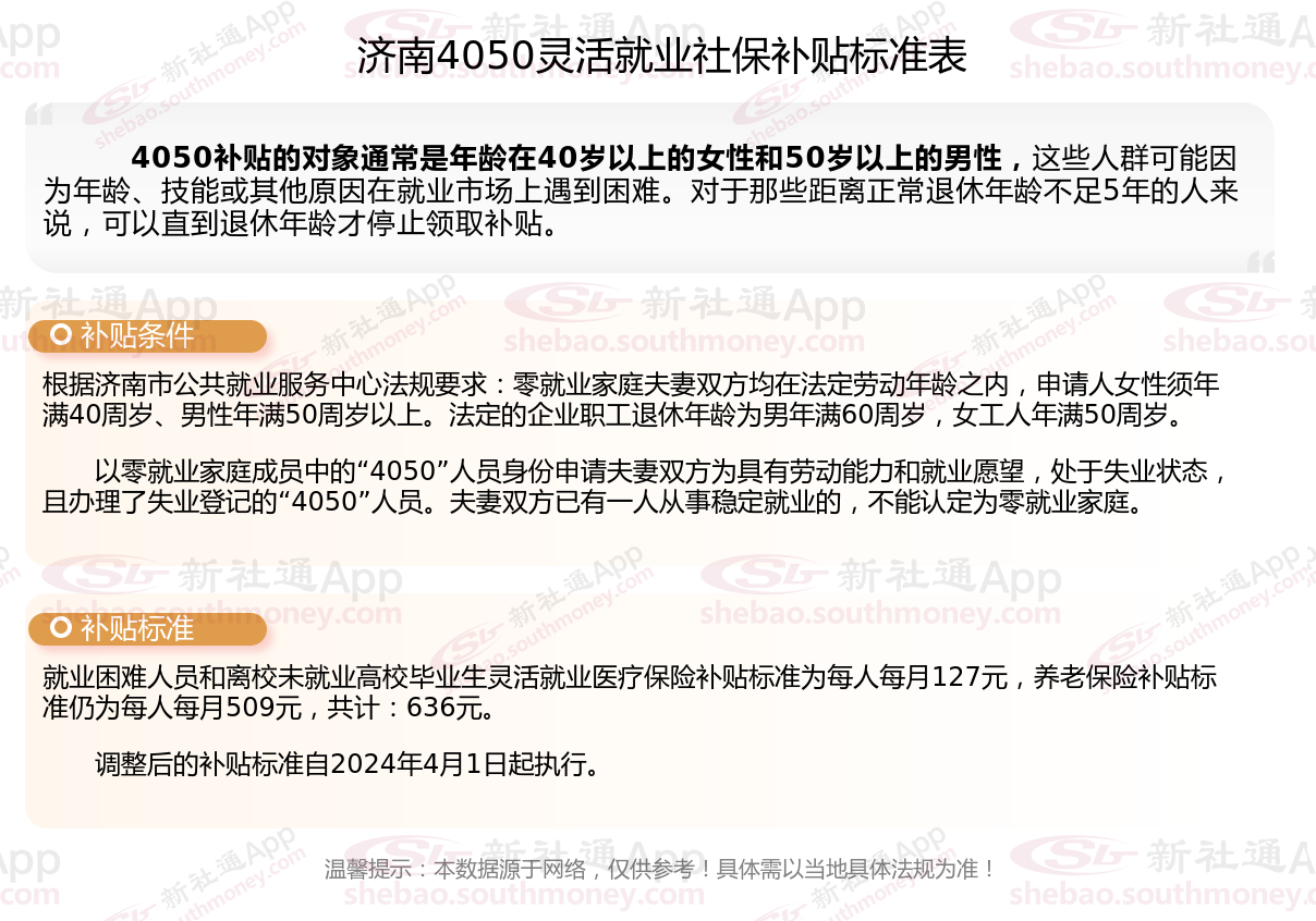 “4050人员”是国对大龄就业困难人员的一种称呼,指的是女性年满40岁,男性年满50岁的人员,那么济南4050灵活就业社保补贴标准是多少钱?济南4050社保补贴条件是什么?接下来随新社通APP小编了解一下最新资讯。