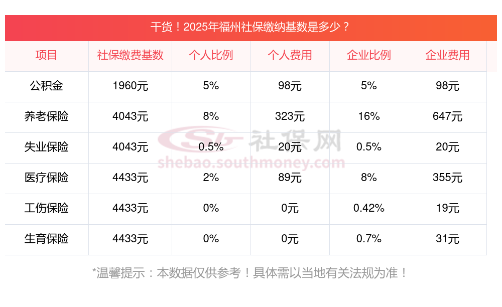 2025年福州社会养老缴纳基数及比例一览表 福州个人缴纳社保每月要多少钱?社保缴费金额受缴费基数、缴费比例,以及当地具体法规等多种因素的综合影响而确定。