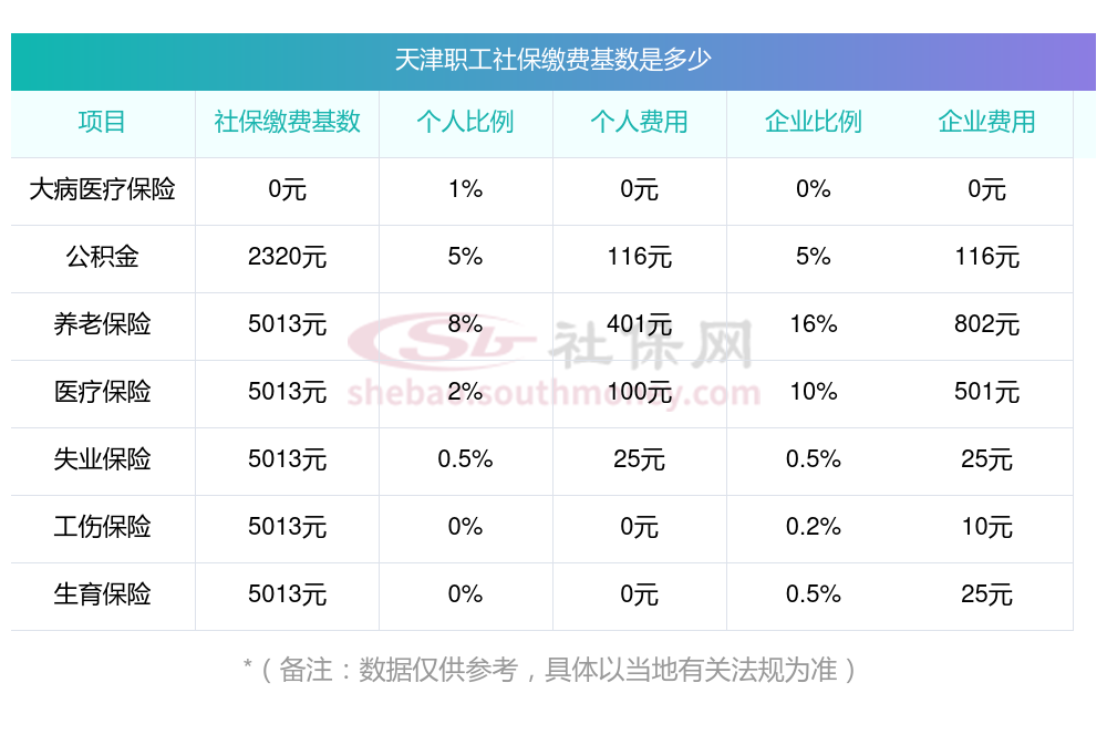 据新社通app小编了解到,2025年天津社保缴费基数参照为3579.00,天津社保缴费明细如下: