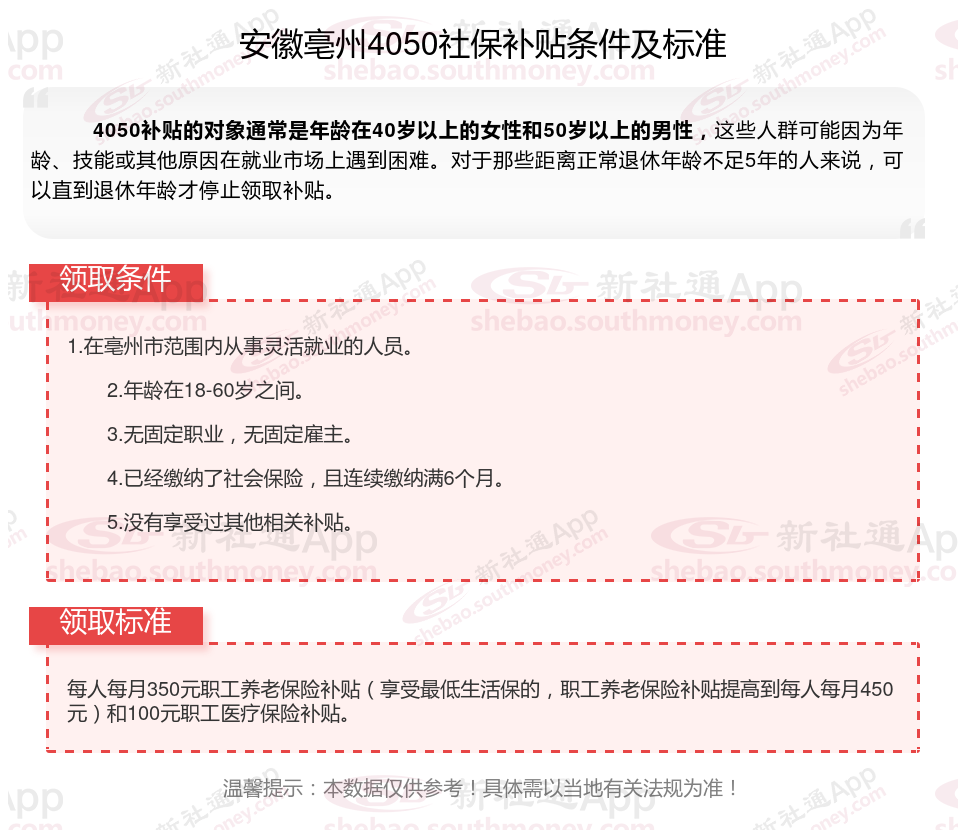 二、安徽亳州4050社保补贴标准及条件2025年最新消息