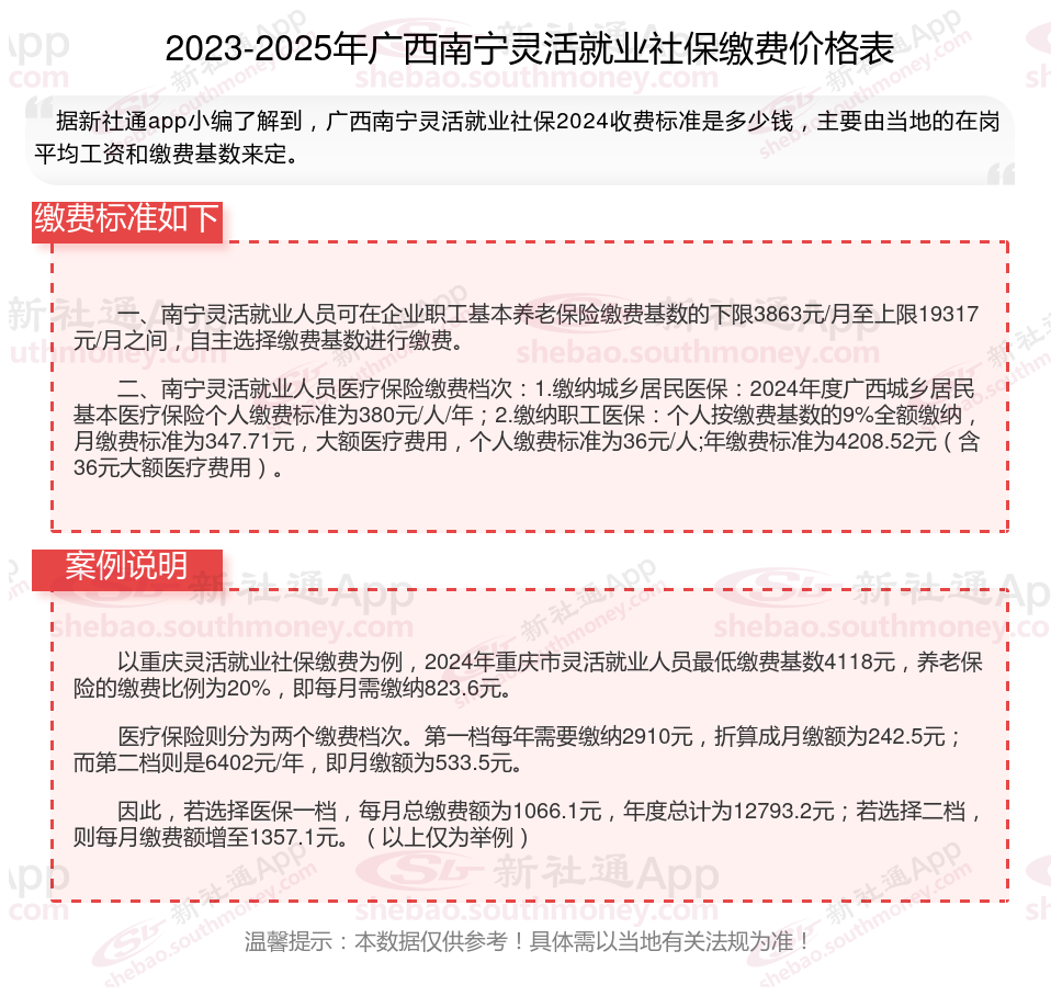 灵活就业社保缴费价格表来了!2024-2025年广西南宁灵活就业人员社保需要缴费多少钱一个月?根据新社通app-社保缴费查询工具提供的最新数据如下: