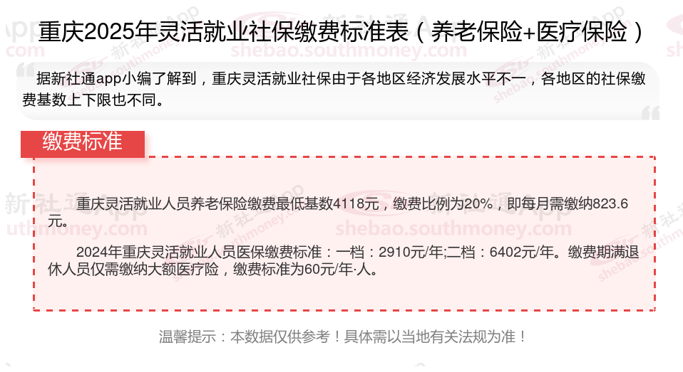 提示:重庆灵活就业人员每个月的缴费压力还是比较大的,每个月的社保费用都是千元,缴费档次越高,灵活就业人员要缴纳的费用也越多。