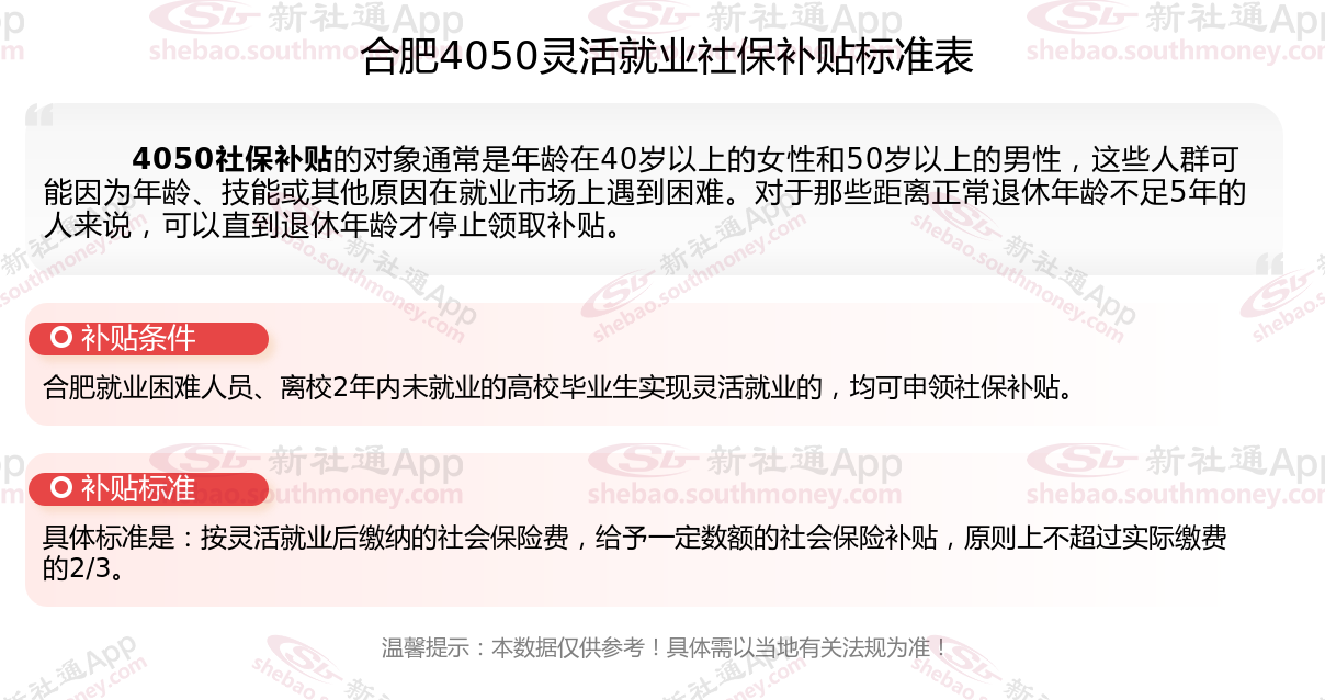 合肥补贴多少钱一个月?合肥灵活就业4050补贴标准: