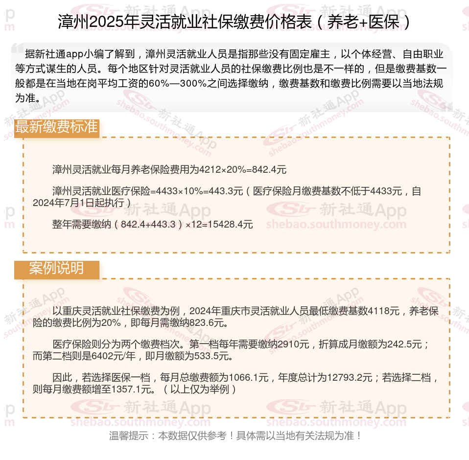 漳州灵活就业社保缴费标准来了 灵活就业人员保险一个月交多少钱?根据新社通app-社保缴费查询工具提供的最新数据如下: